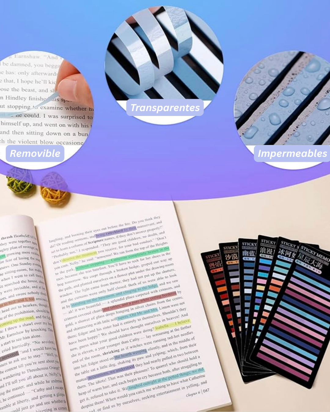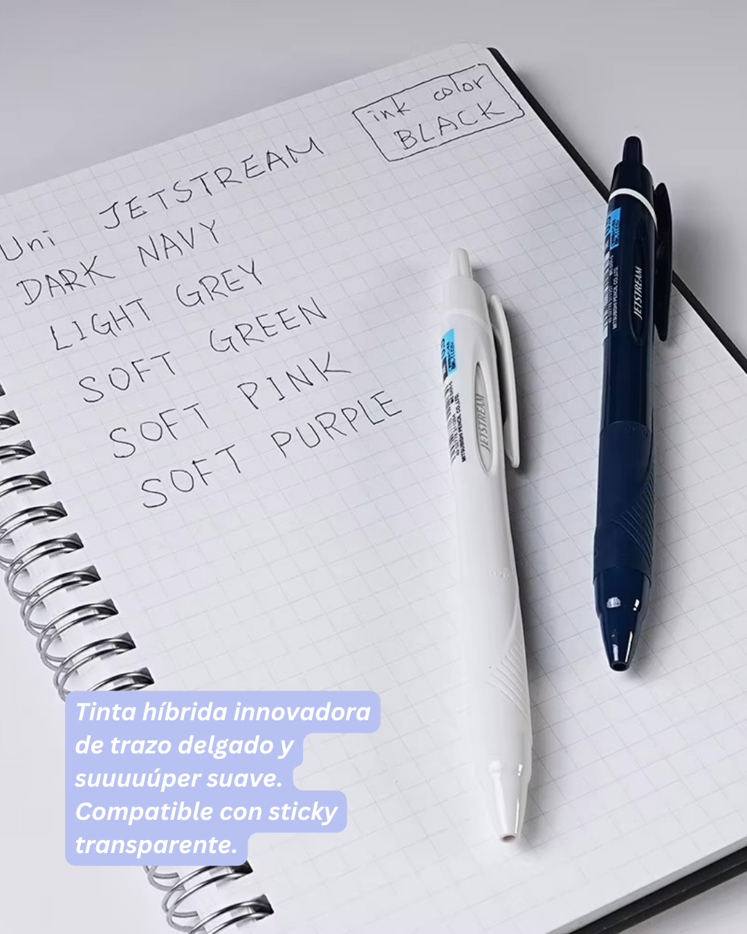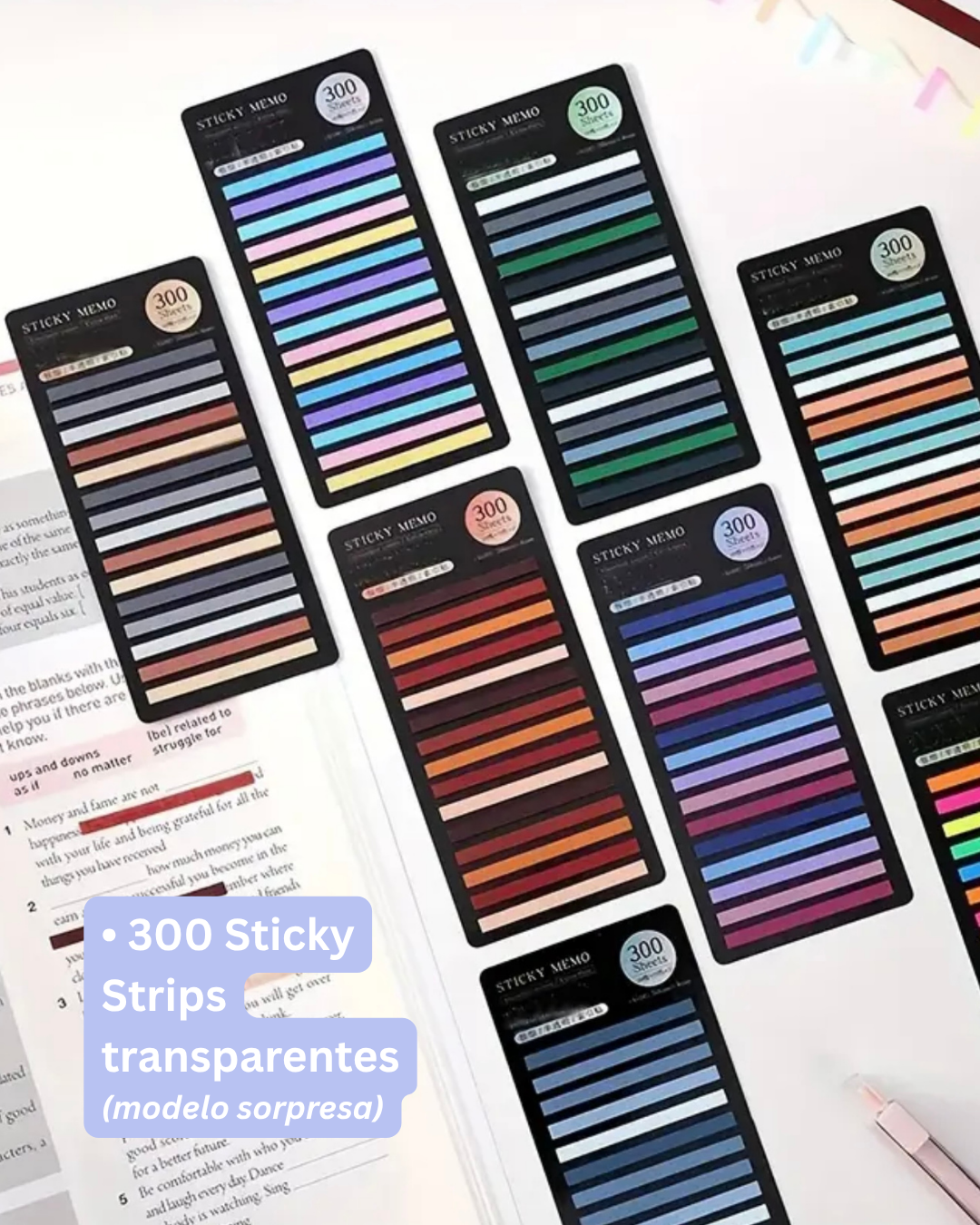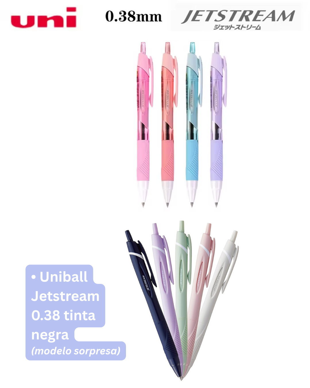 Incluye un Uniball Jetstream negro de tinta híbrida (modelo sorpresa), un Uniball blanco 1.0, un Pentel Touch (color sorpresa), 200 pestañitas transparentes para indexar y 300 Sticky Strips transparentes para resaltar sin dañar tus libros o apuntes.