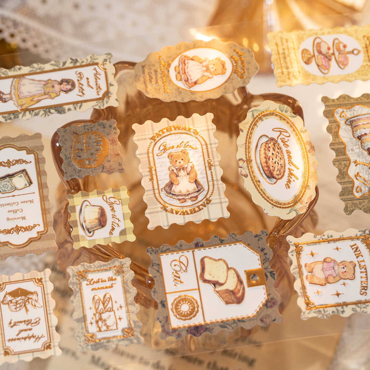 ✨ Stickers tipo estampillas mágicas 📮 con relieve y foil dorado ✨. Diseños de fantasía 🪄 con símbolos y detalles encantados 🌙, ideales para dar un toque místico y elegante a tus creaciones 💌